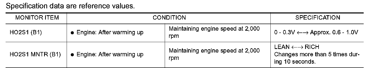 - "HO2S1 MNTR (B1)" in "DATA MONITOR" mode changes from "RICH" to "LEAN" to "RICH" 5 times in 10 seconds.