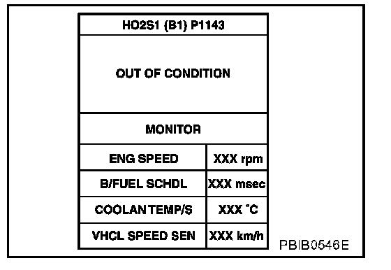 3. Turn ignition switch "ON" and select "HO2S1 (B1) P1143" of "HO2S1" in "DTC WORK SUPPORT" mode with CONSULT-II.