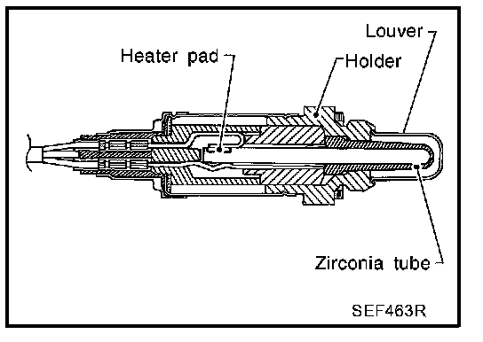 The heated oxygen sensor 1 is placed into the exhaust manifold. It detects the amount of oxygen in the exhaust gas compared to the outside air. The heated oxygen sensor 1 has a closed-end tube made of ceramic zirconia. The zirconia generates voltage from approximately 1V in richer conditions to 0V in leaner conditions. The heated oxygen sensor 1 signal is sent to the ECM. The ECM adjusts the injection pulse duration to achieve the ideal air-fuel ratio. The ideal air-fuel ratio occurs near the radical change from 1V to 0V.