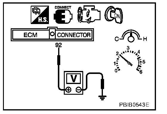 2. Set voltmeter probes between ECM terminal 92 [HO2S1(B1) signal] and engine ground.