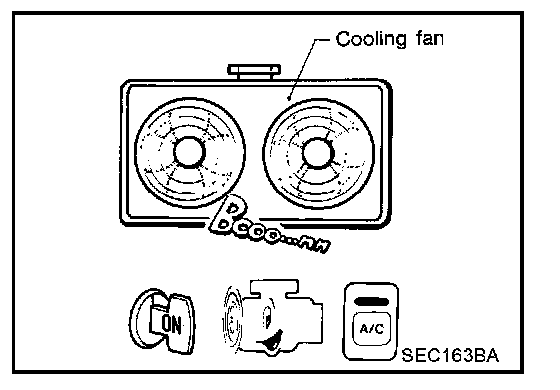 The ECM controls the cooling fan corresponding to the vehicle speed, engine coolant temperature, refrigerant pressure, and air conditioner ON signal. The control system has 3-step control [HIGH/LOW/OFF].