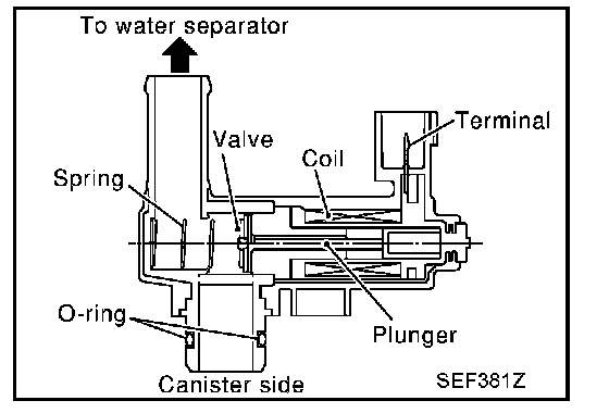 This solenoid valve responds to signals from the ECM. When the ECM sends an ON signal, the coil in the solenoid valve is energized. A plunger will then move to seal the canister vent. The ability to seal the vent is necessary for the on board diagnosis of other evaporative emission control system components.