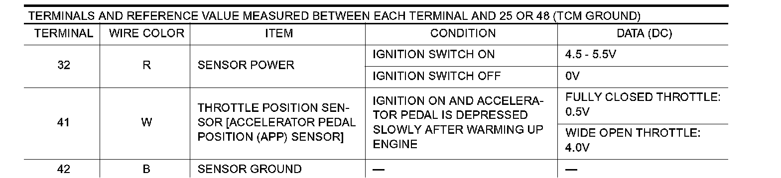 2. Check voltage between TCM terminals 41 and 42 while accelerator pedal is depressed slowly.