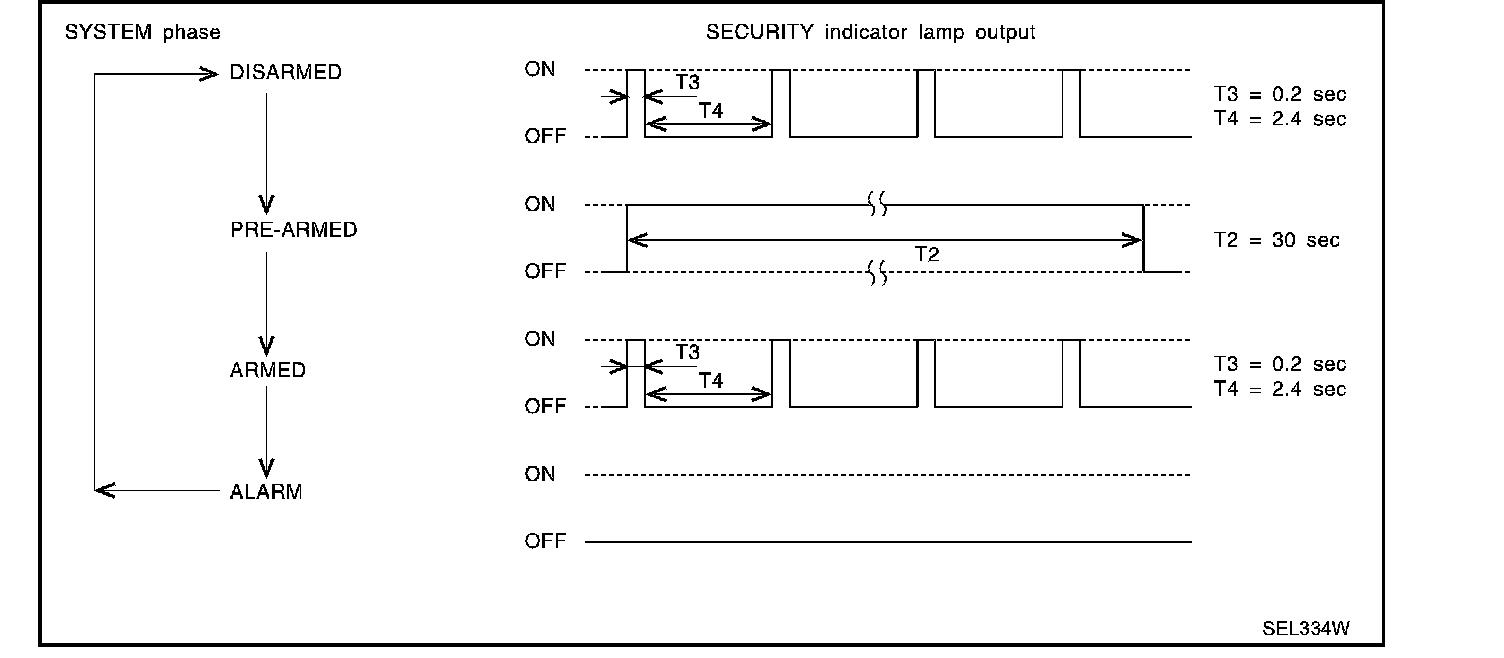When the vehicle security system is in the disarmed phase, the security indicator lamp blinks every 2.6 seconds.