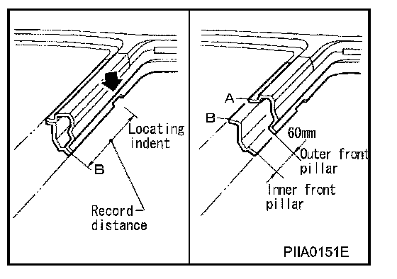 Determine cutting position and record distance from the locating indent. Use this distance when cutting the service part. Cut outer front pillar over 60 mm above inner front pillar cut position.