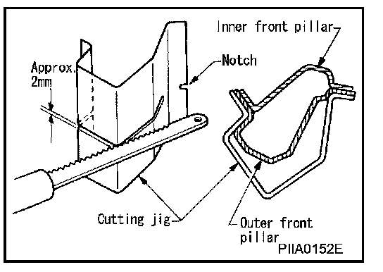 Prepare a cutting jig to make outer pillar easier to cut. Also, this will permit service part to be accurately cut at joint position.