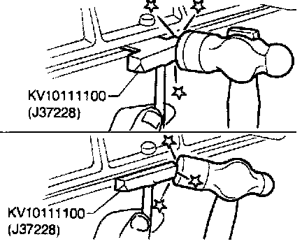 8. Insert the Tool (Seal cutter) between lower oil pan and the upper oil pan to separate them. Tap gently on the side to move the Tool around the pan; do not damage the mating surface.