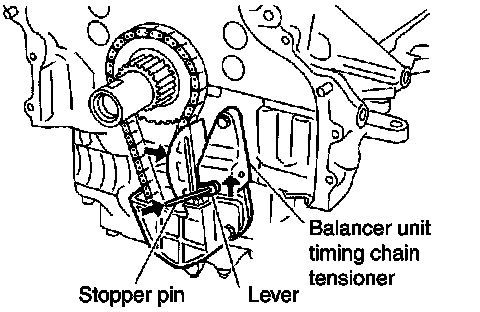 - After installing chain tensioner, remove stopper pin, and make sure the tensioner moves freely.
