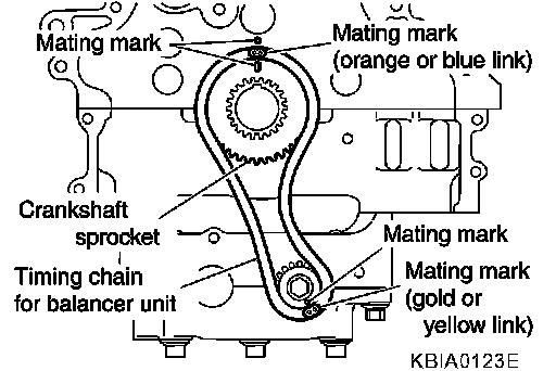 NOTE: Before installing chain tensioner, it is possible to change the position of mating mark on timing chain for that of each sprocket for alignment.