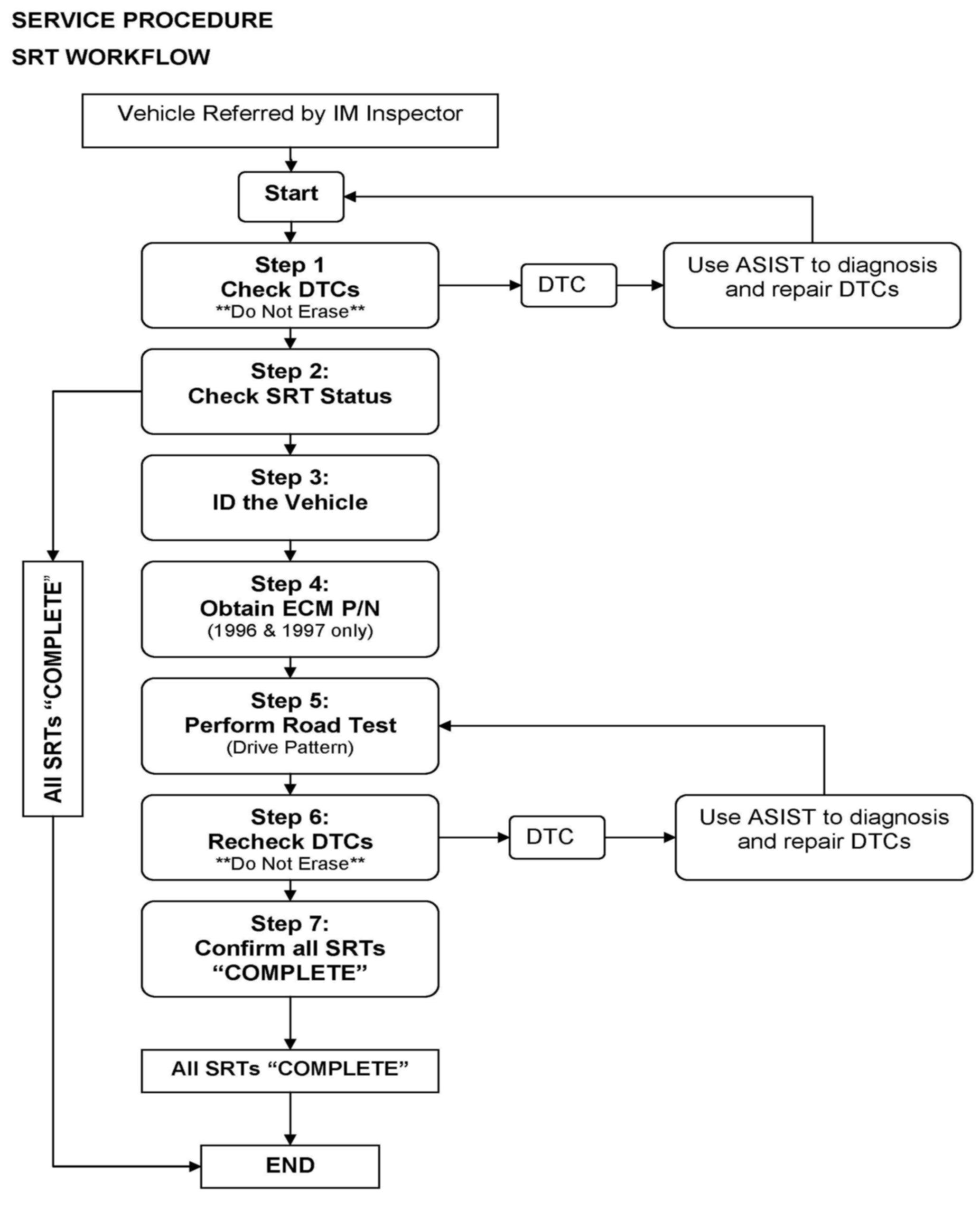 In some cases, the normal driving that occurs between the time the vehicle was referred by the State Emissions Inspection Station and it is brought into the dealership for SRT evaluation may allow the ECM to complete the SRTs. If this occurs, no further action is necessary.