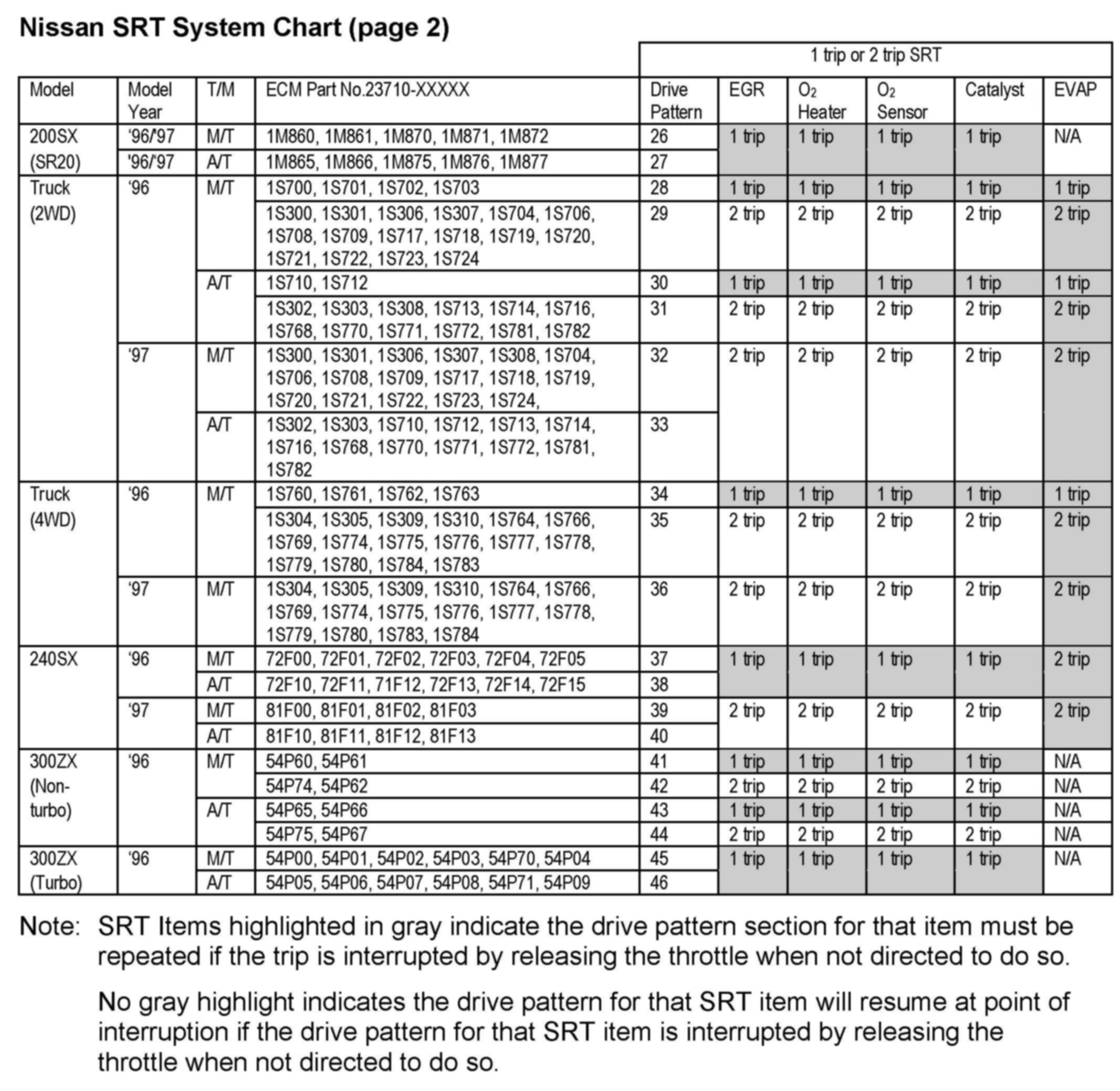 3. Compare the vehicles ECM part number with the list of ECM part numbers provided in the Nissan SRT System Chart above to determine the Drive Pattern for the vehicle being inspected.