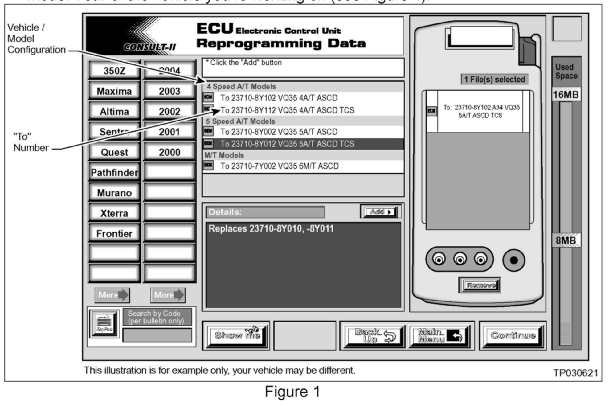 C. Select the "configuration" on the screen for the vehicle you're working on. Then make sure that your current ECM P/N is listed in the "Replaces 23710-XXXXX, - XXXXX, etc" section in the lower, center "Details" panel of the ASIST screen (see Figure 1).