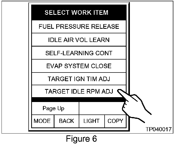 1. In the [CONSULT WORK SUPPORT] mode, select [TARGET IDLE RPM ADJ]. See Figure 6.