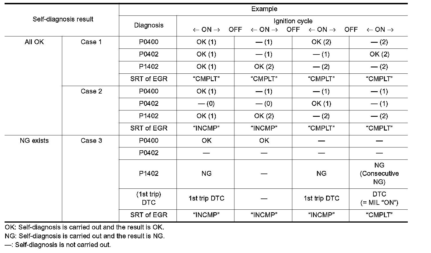 The table shows that the minimum number of cycles for setting SRT as "INCMP" is one (1) for each self-diagnosis (Case 1 & 2) or two (2) for one of self-diagnosis (Case 3). However, in preparation for the state emissions inspection, it is unnecessary for each self-diagnosis to be executed twice (Case 3) for the following reasons:
