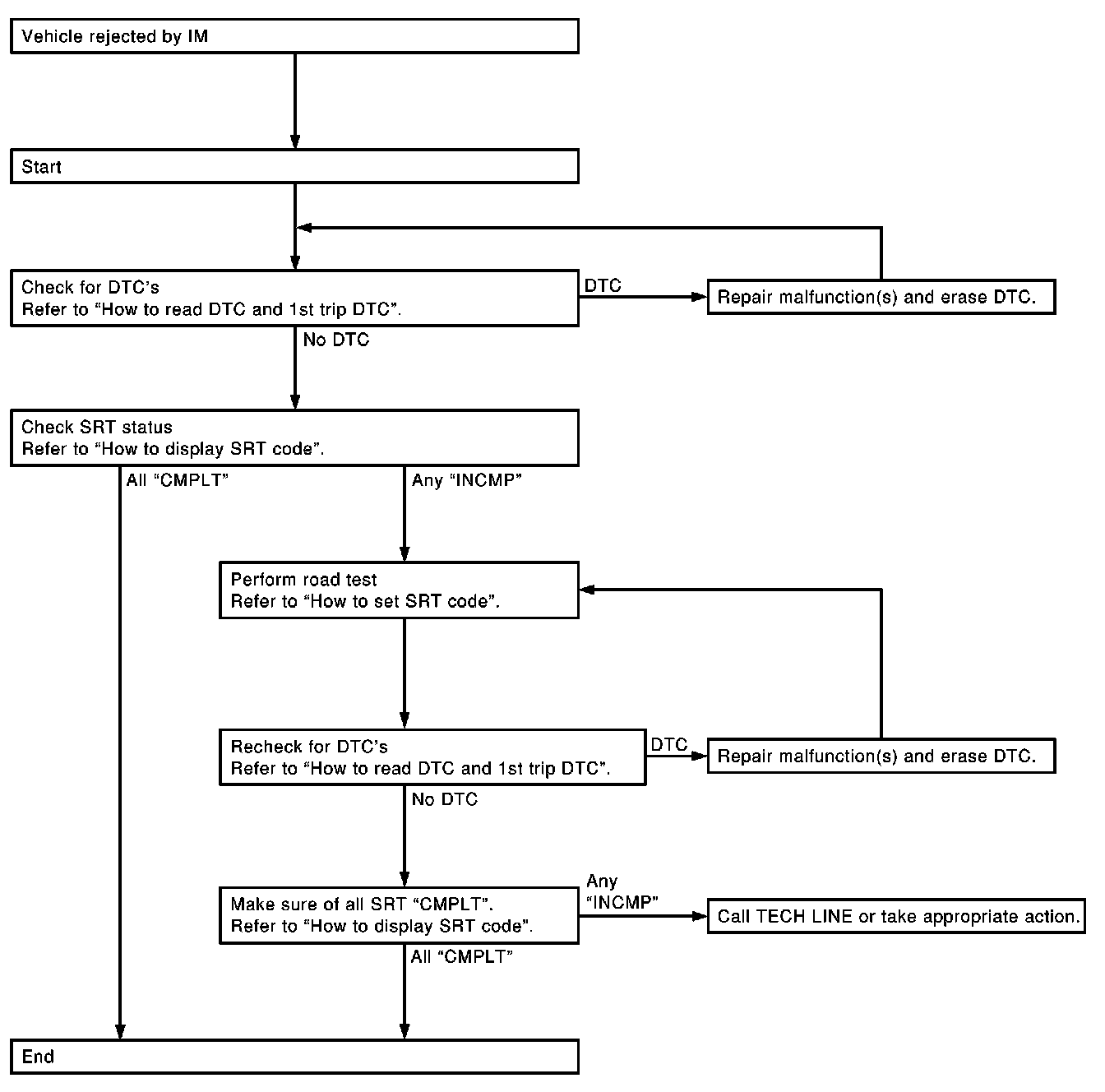 If, during the state emissions inspection, the SRT indicates "CMPLT" for all test items, the inspector will continue with the emissions test. However, if the SRT indicates "INCMP" for one or more of the SRT items the vehicle is returned to the customer untested.