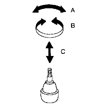 ^ Check ball joint for play. Replace transverse link assembly if any of the following cases occur: Ball stud is worn, play in axial direction is excessive or joint is hard to swing. Before checking, turn ball joint at least 10 revolutions so that ball joint is properly broken in.