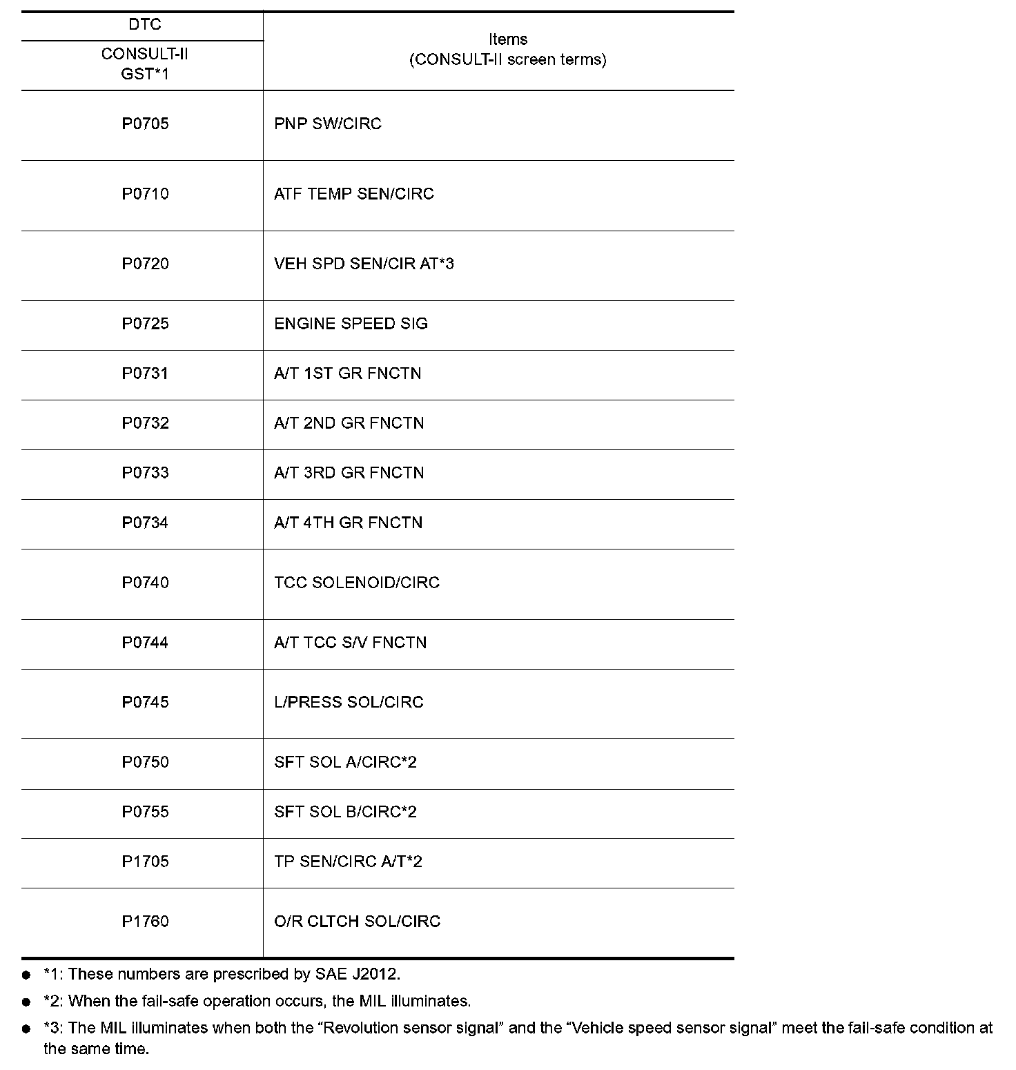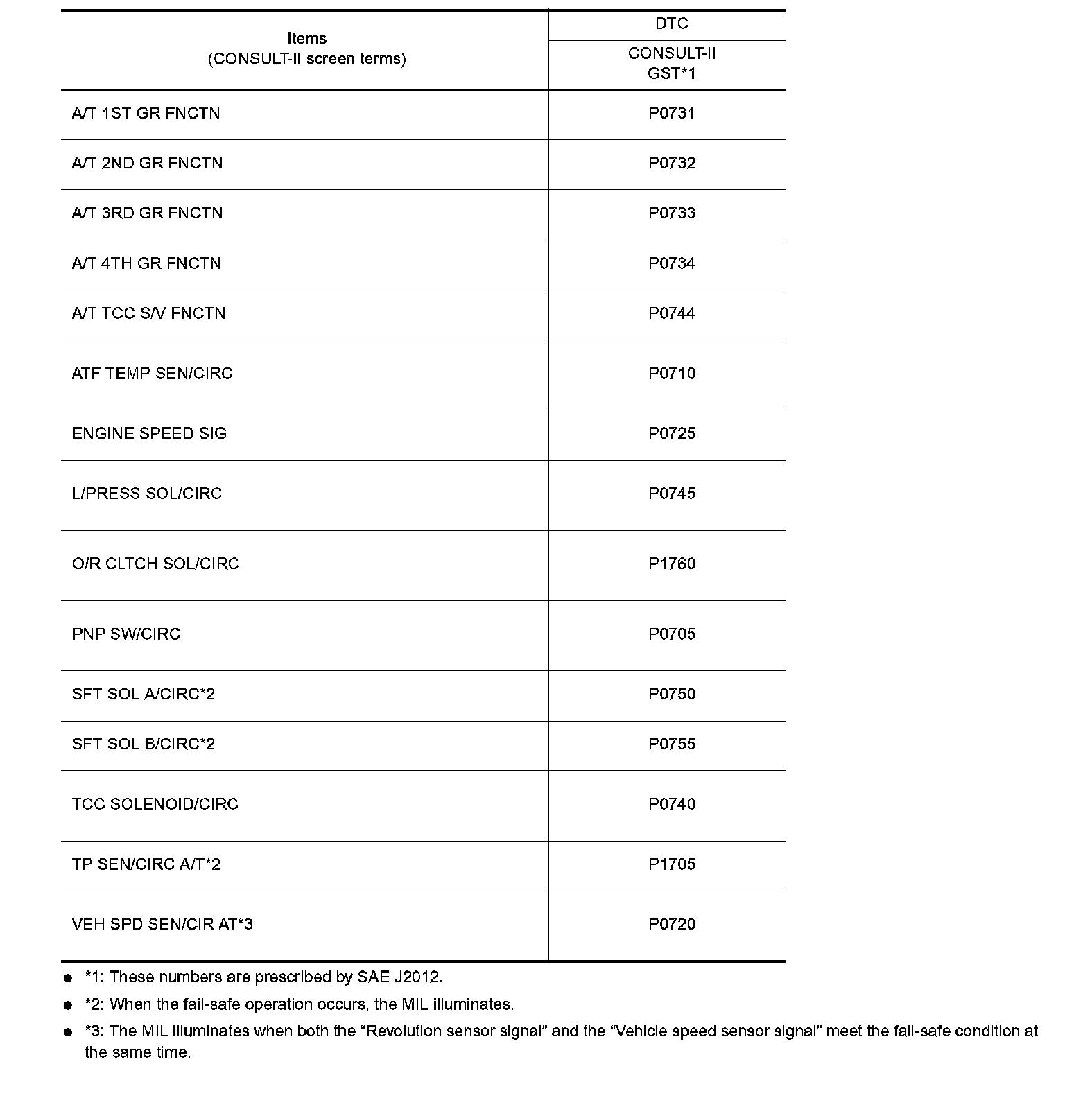 - *3: The MIL illuminates when both the "Revolution sensor signal" and the "Vehicle speed sensor signal" meet the fail-safe condition at the same time.