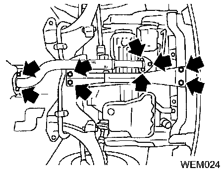 When lifting engine, be sure to clear surrounding parts. Use special care near brake tubes and brake master cylinder.