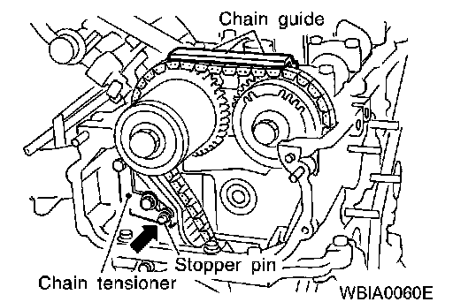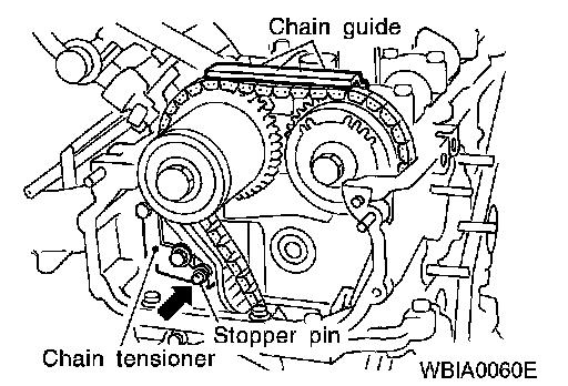 ^ Before installing chain tensioner, insert a suitable pin into pin hole of chain tensioner.