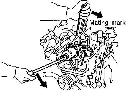^ Rotate crankshaft until mating mark on camshaft sprocket is set at position indicated in figure.