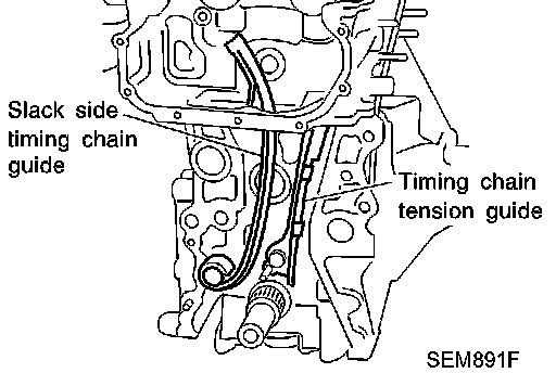 ^ After removing timing chain, do not turn crankshaft and camshaft separately, or valves will strike piston heads.