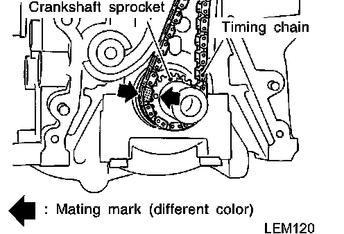 ^ Set timing chain by aligning its mating mark with that on the crankshaft sprocket.