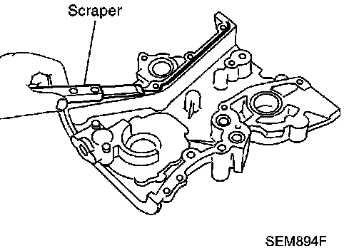 10. Before installing front cover, remove all traces of RTV silicone sealant from mating surface using a scraper.