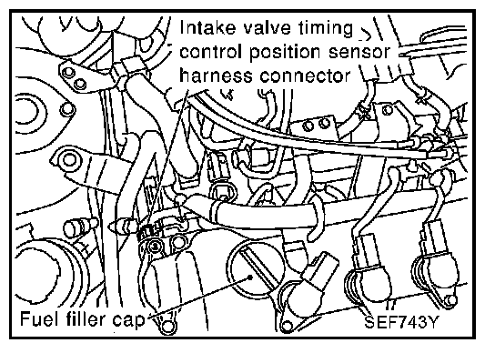 The intake valve timing control position sensor is located in front of the cylinder head. This sensor detects a signal (intake valve position) generated by the protrusion of camshaft sprocket and sends it to the ECM. This sensor is not used to control the engine system. It is used only for the on board diagnosis of intake valve timing control.