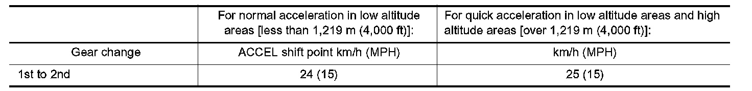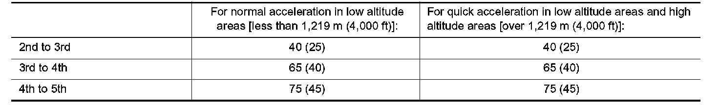 Shown are suggested vehicle speeds for shifting into a higher gear. These suggestions relate to fuel economy and vehicle performance. Actual upshift speeds will vary according to road conditions, the weather and individual driving habits.