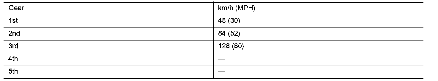 Do not exceed the maximum suggested speed (shown) in any gear. For level road driving, use the highest gear suggested for that speed. Always observe posted speed limits and drive according to the road conditions to ensure safe operation. Do not over-rev the engine when shifting to a lower gear as it may cause engine damage or loss of vehicle control.