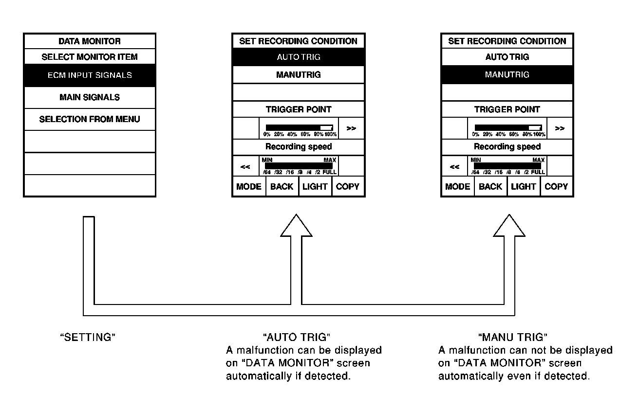 CONSULT-II has two kinds of triggers and they can be selected by touching "SETTING" in "DATA MONITOR" mode.
