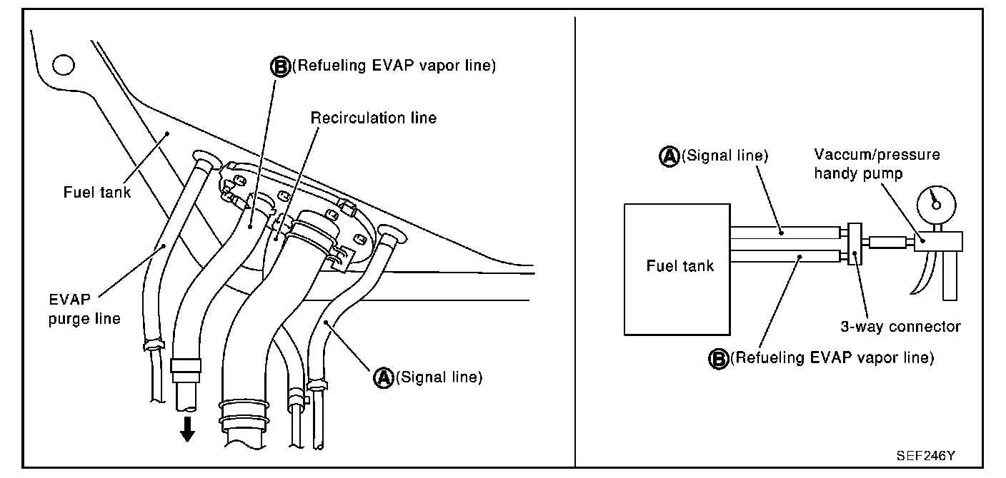 - Apply vacuum pressure to both hose ends A and B [-13.3 kPa (-100 mmHg, -3.94 inHg)] with fuel level sensor unit retainer remaining open and check that the pressure is applicable.