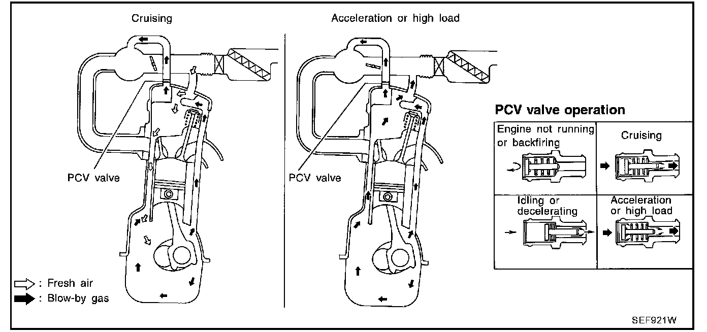 Under full-throttle condition, the manifold vacuum is insufficient to draw the blow-by flow through the valve. The flow goes through the hose connection in the reverse direction.