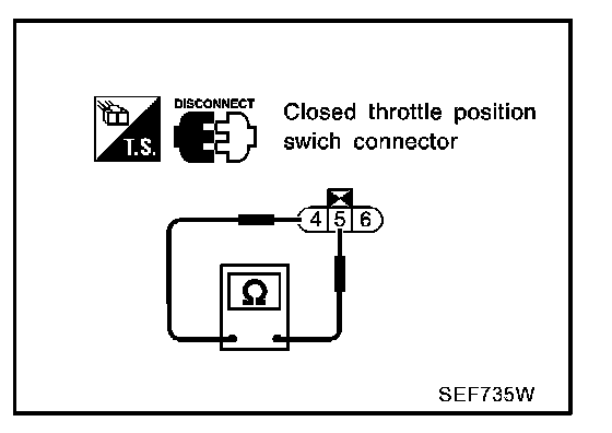 7. Check continuity between closed throttle position switch terminals 6 and 5 under the given conditions.