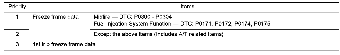 Only one set of freeze frame data (either 1st trip freeze frame data of freeze frame data) can be stored in the ECM. 1st trip freeze frame data is stored in the ECM memory along with the 1st trip DTC. There is no priority for 1st trip freeze frame data and it is updated each time a different 1st trip DTC is detected. However, once freeze frame data (2nd trip detection/MIL on) is stored in the ECM memory, 1st trip freeze frame data is no longer stored. Remember, only one set of freeze frame data can be stored in the ECM.