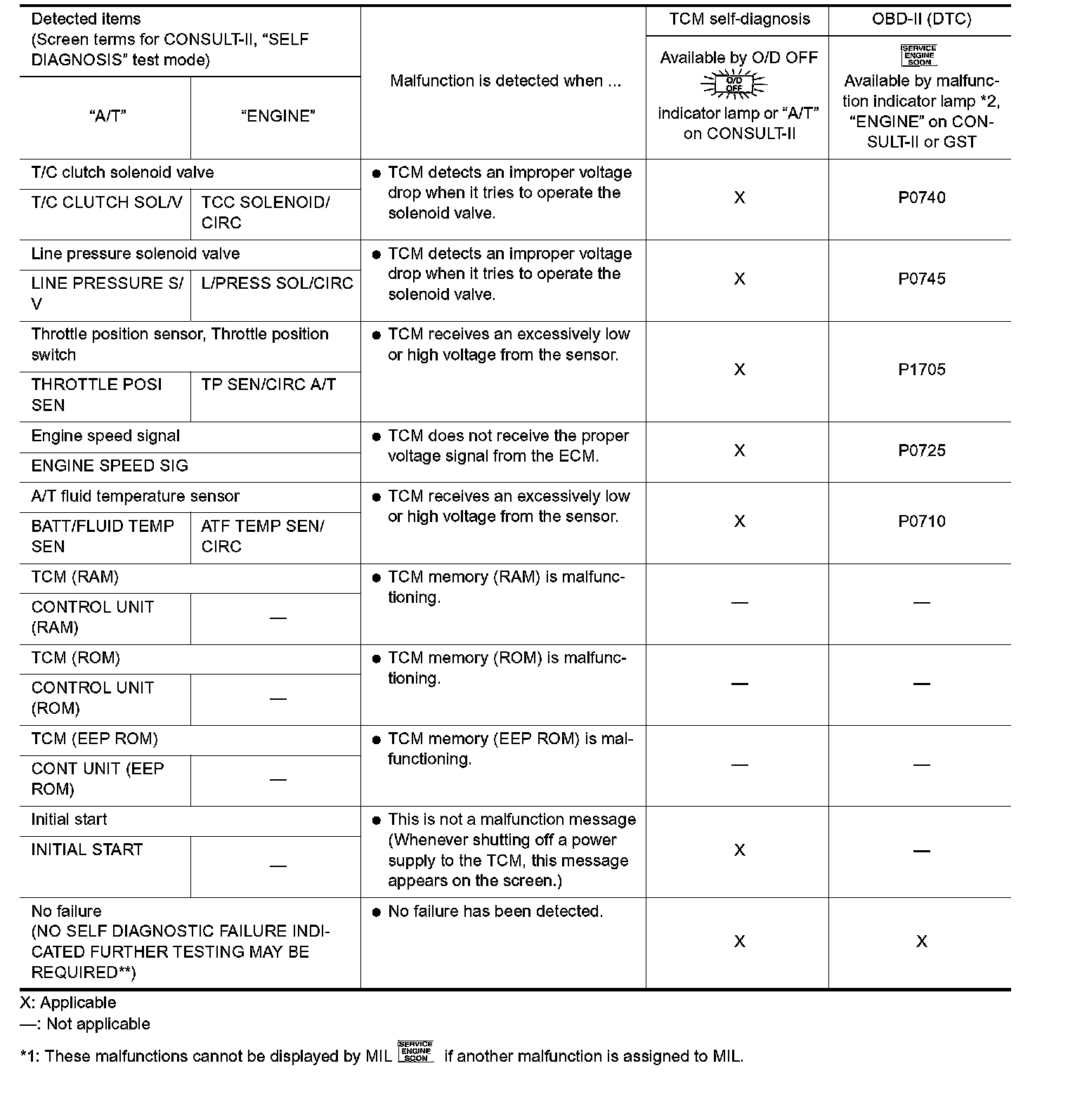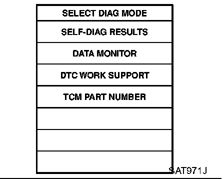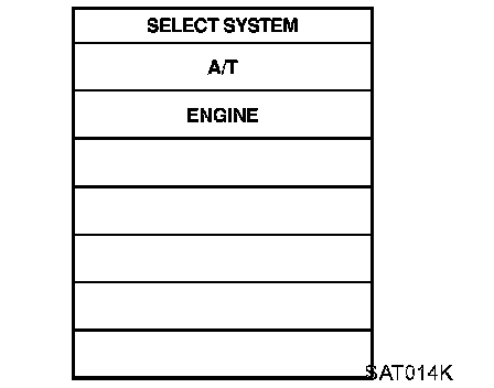 1. Turn on CONSULT-II and touch "ENGINE" for OBD-II detected items or touch "A/T" for TCM self-diagnosis. If A/T is not displayed, check TCM power supply and ground circuit. Refer to "TROUBLE DIAGNOSIS FOR POWER SUPPLY". If result is NG, refer to "POWER SUPPLY ROUTING"