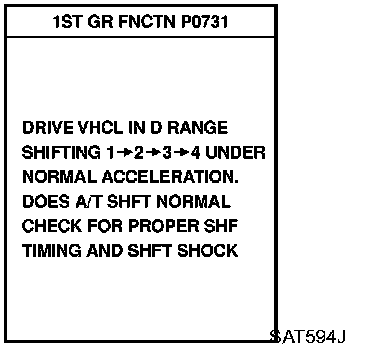 Check for time difference between actual shift timing and the CONSULT-II display. If the difference is noticeable, mechanical parts (except solenoids, sensors, etc.) may be malfunctioning. Check mechanical parts using applicable diagnostic procedures.