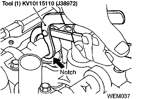 2. Place Tool (1) around camshaft as shown in figure. Before placing Tool (1), rotate notch toward center of cylinder head. (See figure.) This will simplify shim removal later.
