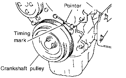 5. Turn crankshaft one revolution (360°) and align mark on crankshaft pulley with pointer.