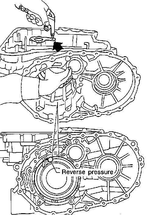 7. Apply compressed air to oil hole of transmission case while holding piston.