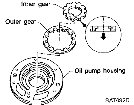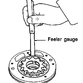 - Measure side clearance of inner and outer gears in at least four places around each outside edge. Maximum measured values should be within specified range.