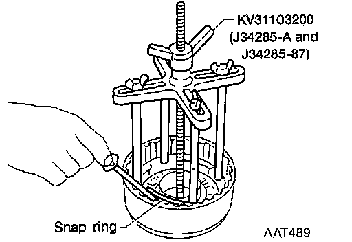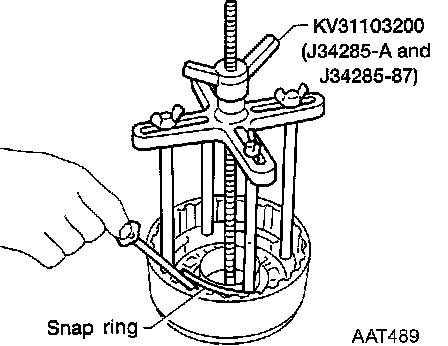 4. Set Tool on spring retainer and remove snap ring from reverse clutch drum while compressing return springs.