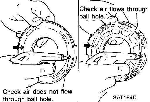- Apply compressed air to oil hole on return spring side to make sure air leaks past ball.