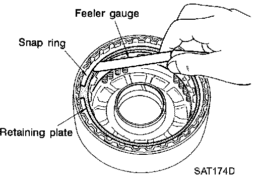 7. Measure clearance between retaining plate and snap ring. If not within allowable limit, select proper retaining plate.
