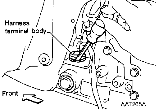5. Remove A/T solenoid harness by pushing terminal body into transmission case.