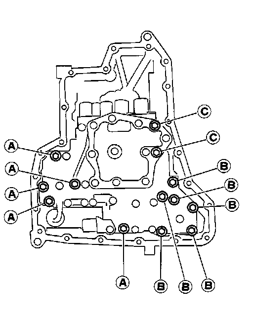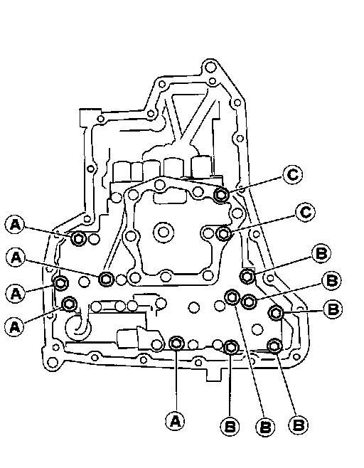6. Remove control valve assembly mounting bolts A, B and C.