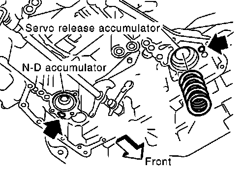 7. Disassemble and inspect control valve assembly if necessary. 8. Remove servo release and N-D accumulators by applying compressed air if necessary.