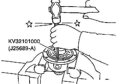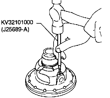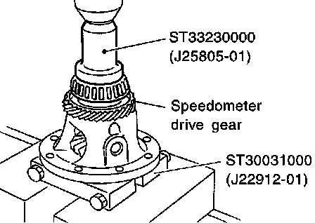4. Turn differential case upside down, and remove differential side bearing of speedometer drive gear side using Tool.