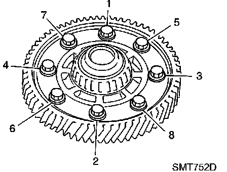 13. Install differential gear into differential case. Apply sealant onto mounting bolts, and tighten them in order as shown in the figure with specified torque.