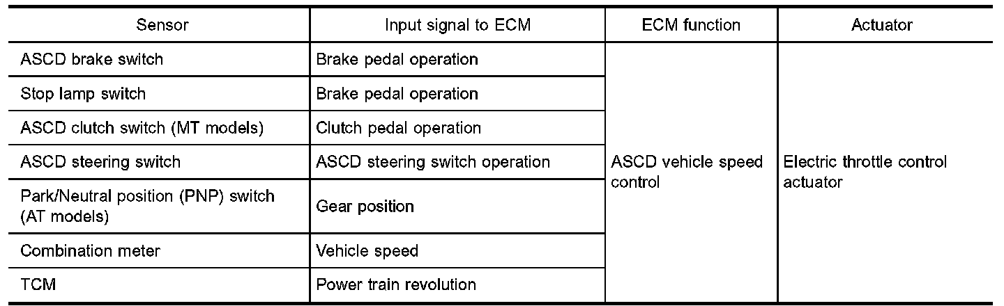 ECM controls throttle valve operating angle of electric throttle control actuator to regulate engine speed. Operation status of ASCD is indicated by CRUISE indicator and SET indicator in combination meter. If any malfunction occurs in ASCD system, it automatically deactivates control.